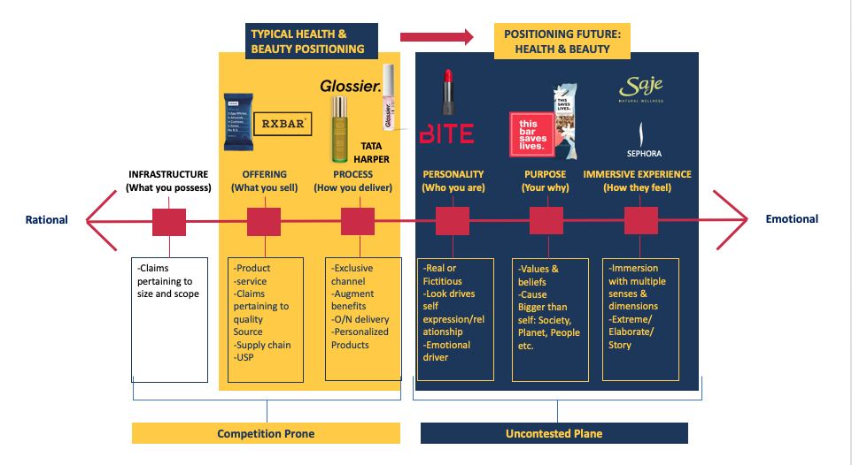 Personality( who you are), Purpose(your why) and Immersive experience( how they feel) come under Uncontested Zone, which is the way forward for health and beauty brands.