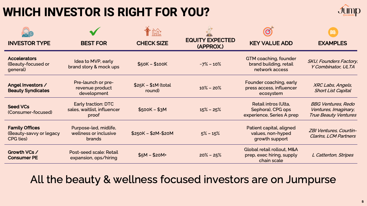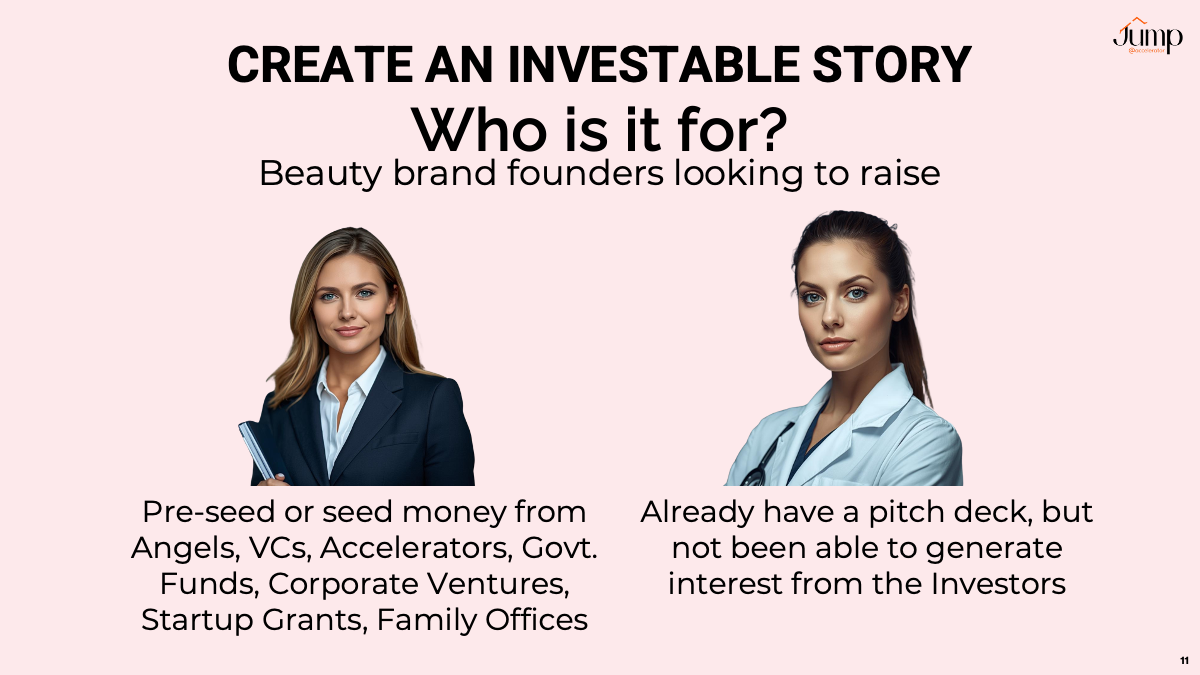 -Beauty brand founders looking to raise pre-seed or seed money from Angels, VCs, Accelerators, Govt. Funds, Corporate Ventures, Startup Competitions, Family Offices.