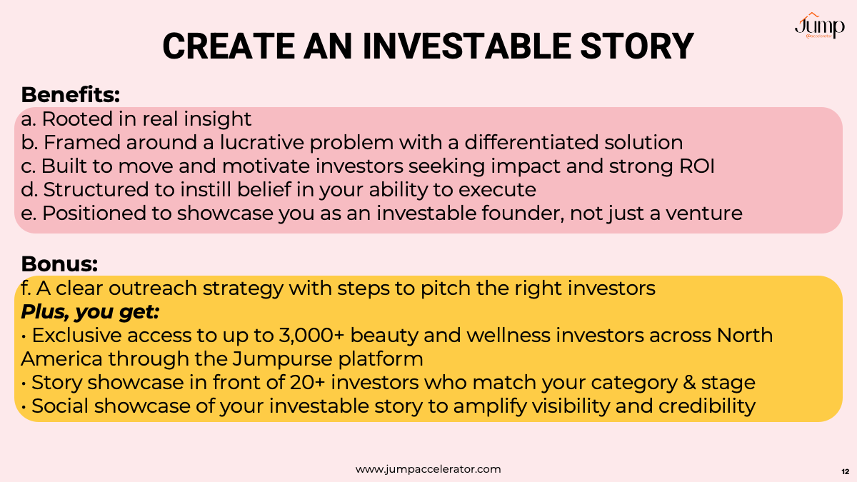 • Exclusive access to up to 3,000+ beauty and wellness investors across North America through the Jumpurse platform