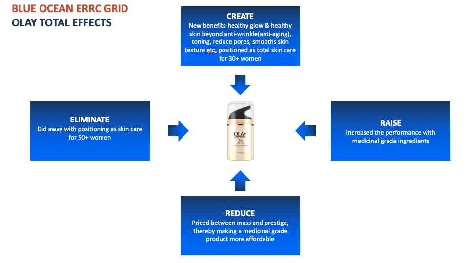 1. Olay Total Effects created a new category, whereby, it introduced a medical grade skin care product in high-end, non-medical retail at a premium price point with virtually no competition at all. Olay Total Effects was an “order of magnitude” better product and used strongly endorsed by master brand architecture.
