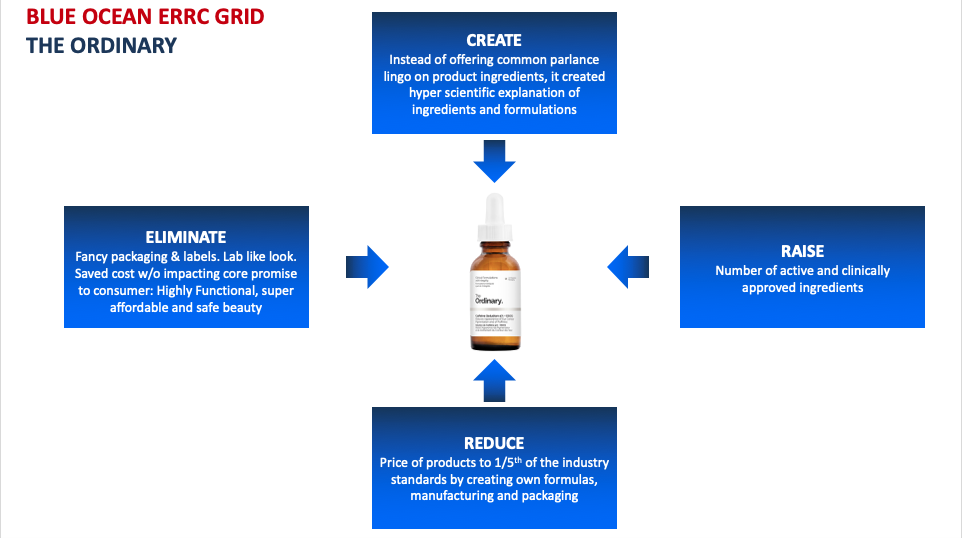 2. The Ordinary by DECEIM is yet another example of transformational innovation that offered a product with an order of magnitude better performance, for the price, as well as created new demand for nerdy and non-consumers at 1/3rdto 1/5ththe price point, creating a blue ocean. Architecture is of an independent brand or weakly endorsed by DECEIM.