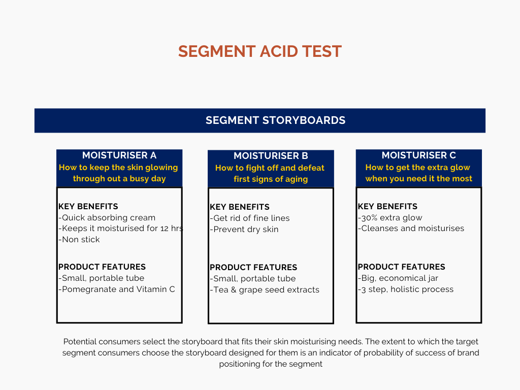 Show the three different storyboards to 3 different pre-selected segments, and if most of the target segment respondents select the storyboard designed for them and find it attractive means the brand story value proposition has survived the segment acid test.