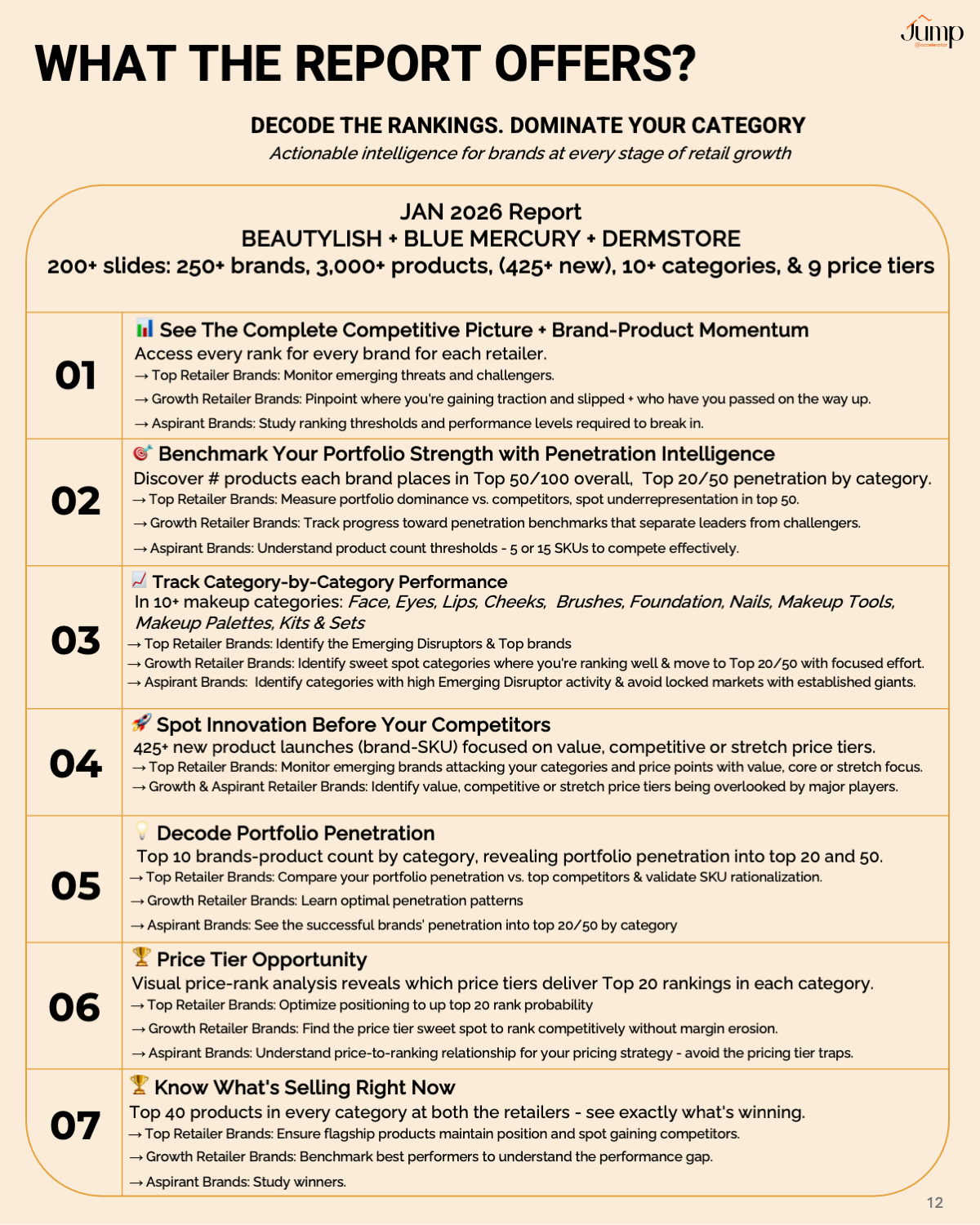 The report covers for Jan 2026 for Beautylish + Blue Mercury + Dermstore in 200+ slides: 250+ brands, 3,000+ products, (425+ new), 10+ categories, & 9 price tiers