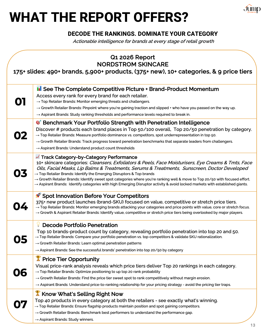 The report covers for Q1 2026 for Nordstrom Skincare in 175+ slides: 490+ brands, 5,900+ products, (375+ new), 10+ categories, & 9 price tiers