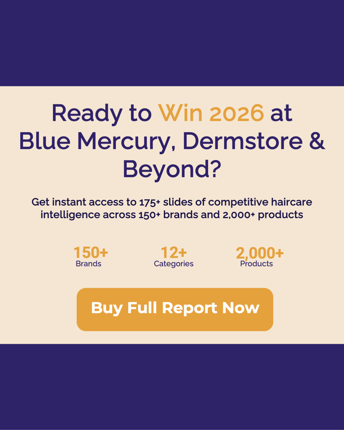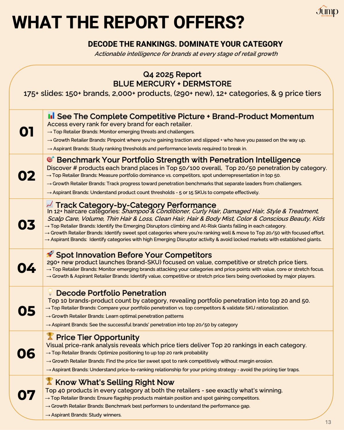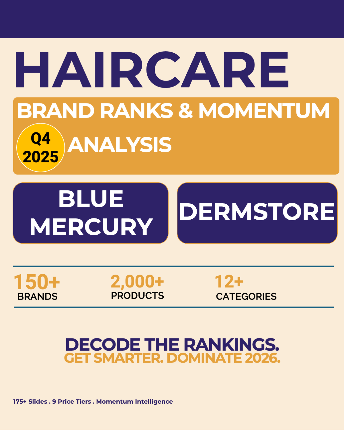 The report covers for Q4 2025 for BLUE MERCURY + DERMSTORE HAIRCARE in 175+ slides for 150+ brands, 2,000+ products, 12+ categories, & 9 price tiers.