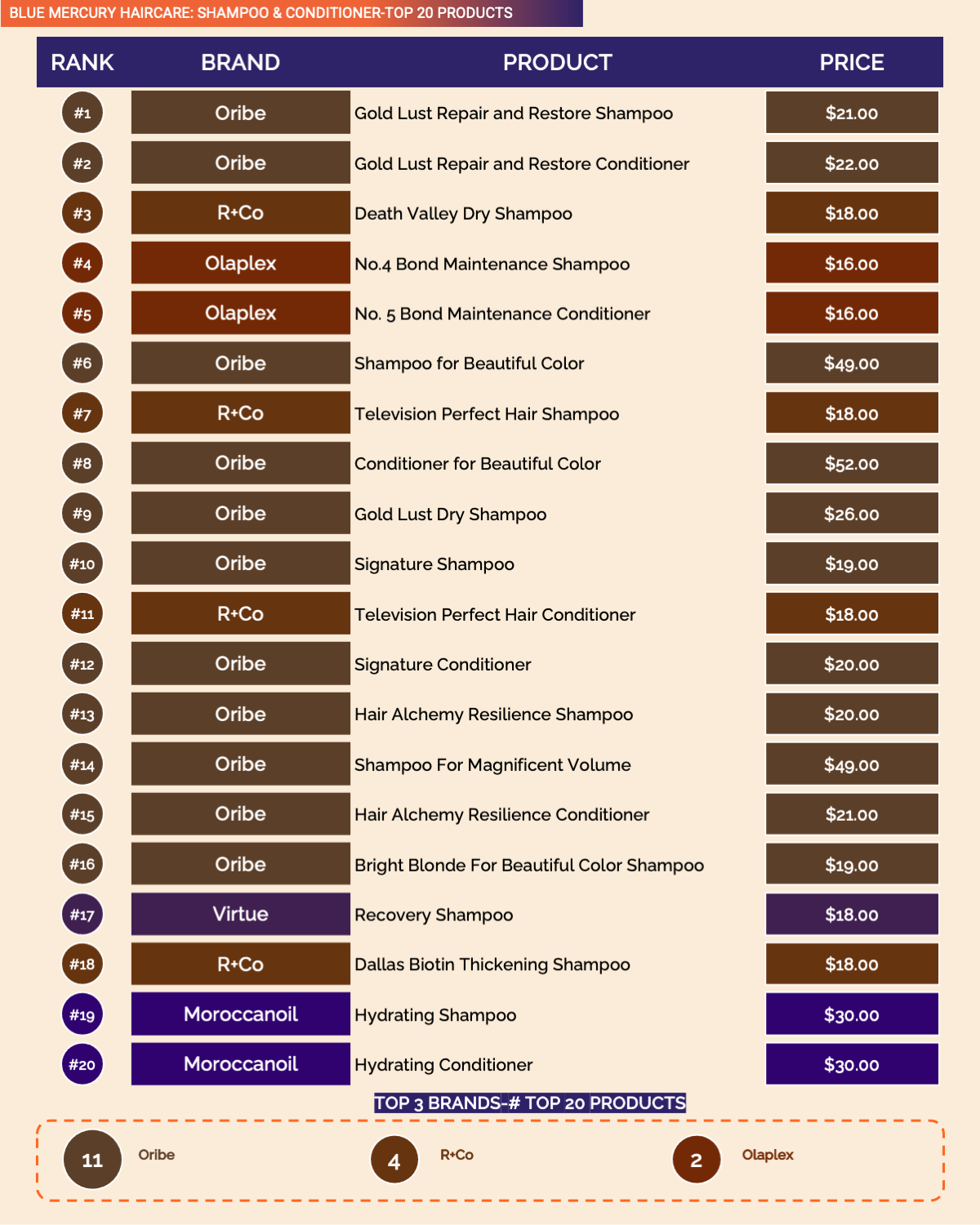 Every ranking position for 150+ brands, 2,000+ products across 12+ categories at Blue Mercury. Number of Top 20/50 products for each brand along with their price tiers.