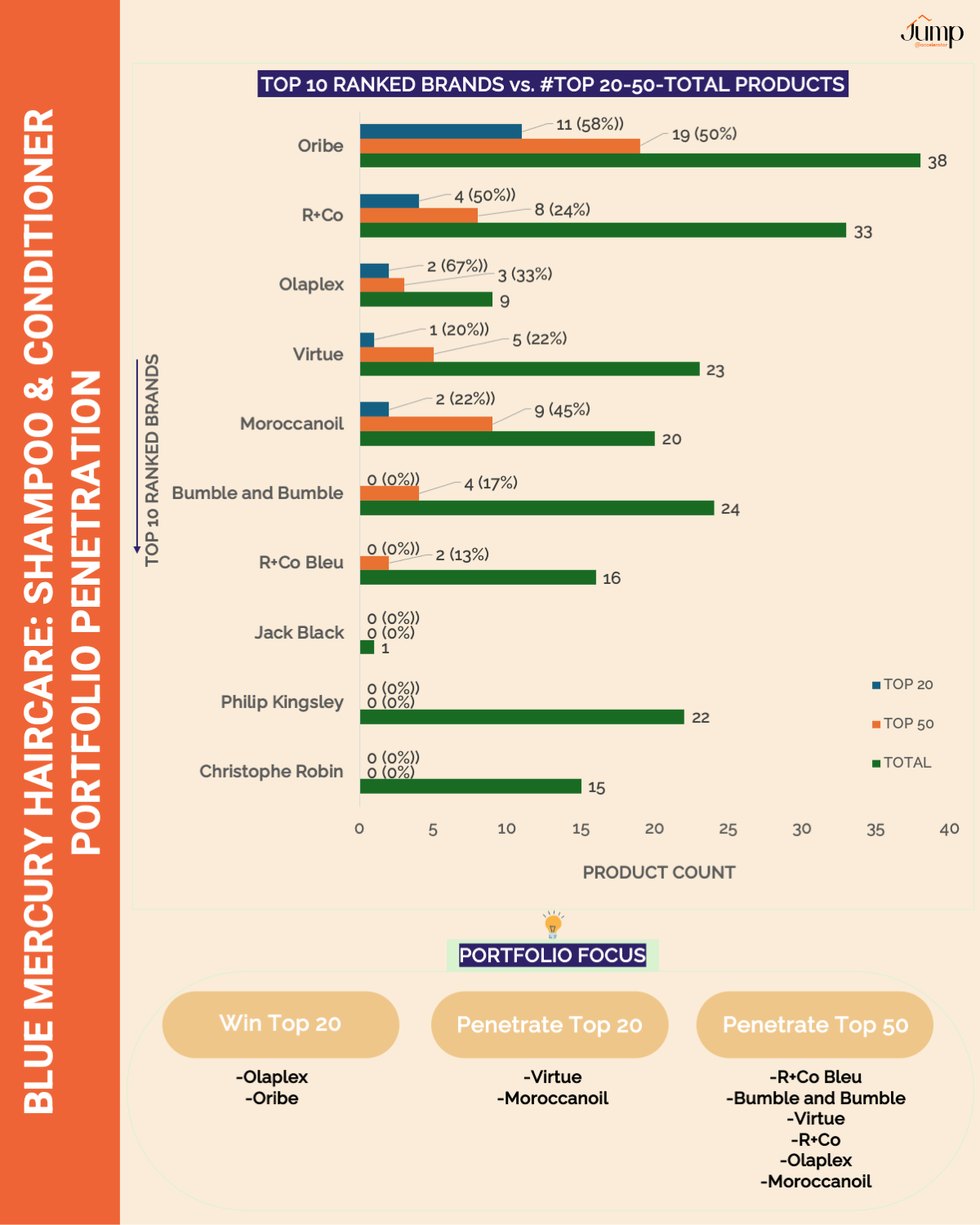 Top 10 brands-product count plotted and analyzed by category, revealing portfolio penetration into top 20 and 50 for each haircare category.