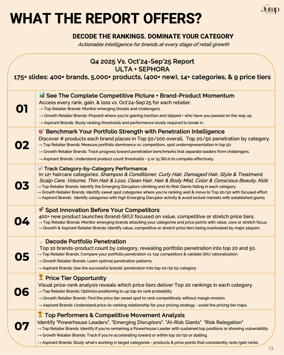 Every ranking position for 400+ brands, 5,000+ products across 12+ categories at Ulta & Sephora. Brand ranks plus gains & losses tables tracking Oct’24-Sep’25 → Q4 2025. Number of Top 20/50 products for each brand along with their price tiers.
