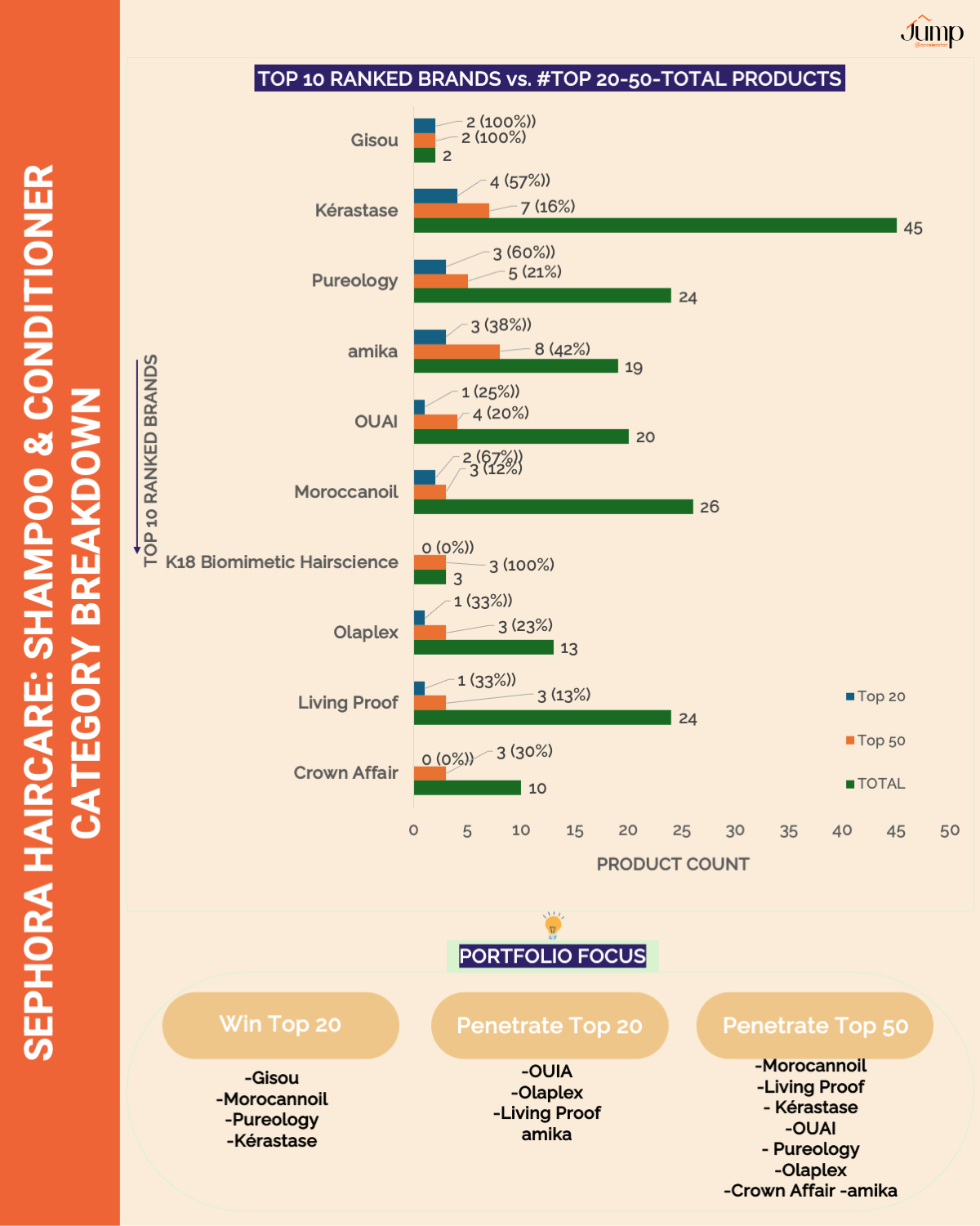 Top 10 brands-product count plotted and analyzed by category, revealing portfolio penetration into top 20 and 50 for each haircare category.