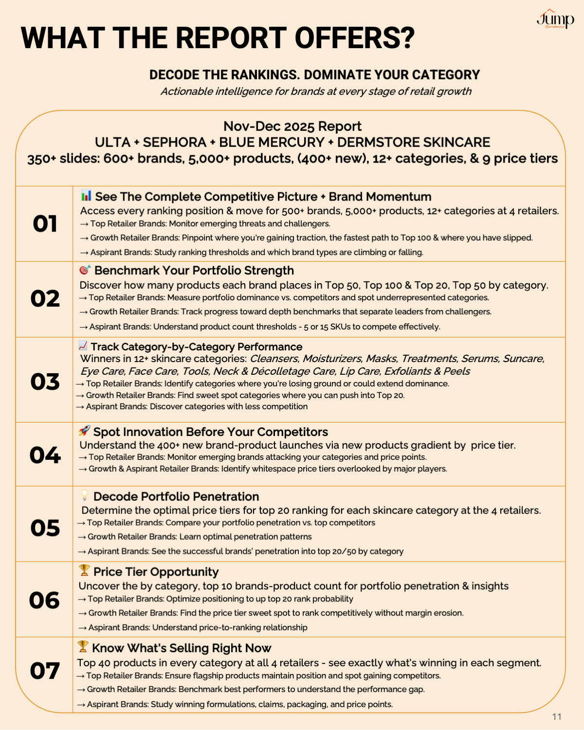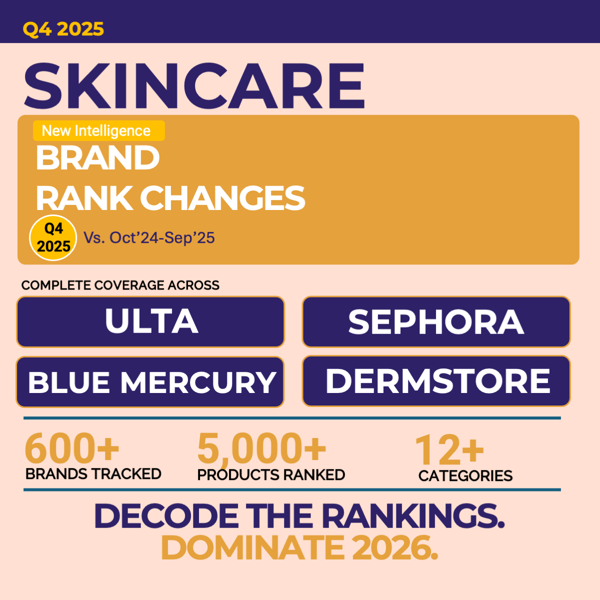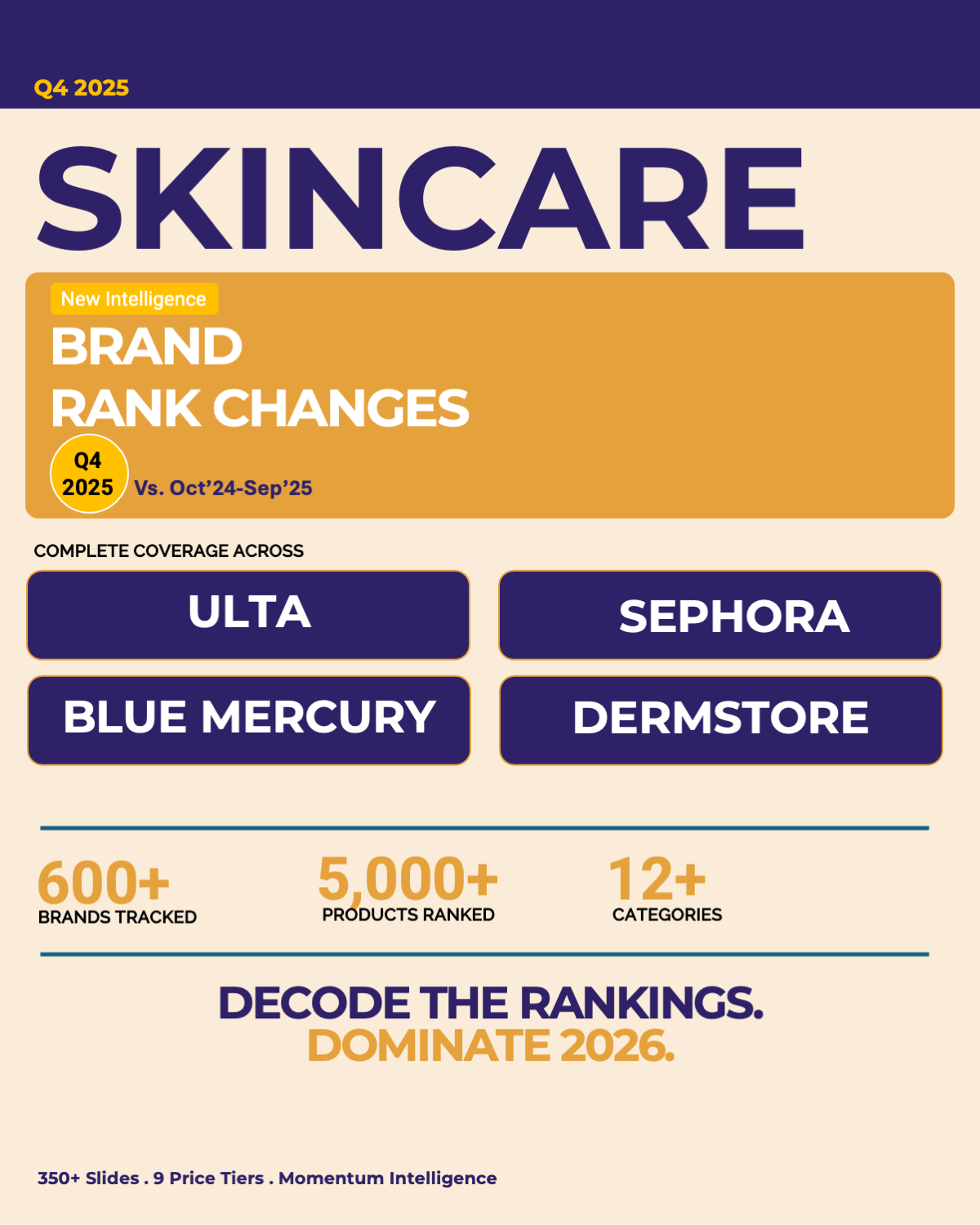 The report covers for Q4 2025 for ULTA + SEPHORA + BLUE MERCURY + DERMSTORE SKINCARE in 350+ slides for 600+ brands, 5,000+ products, 12+ categories, & 9 price tiers